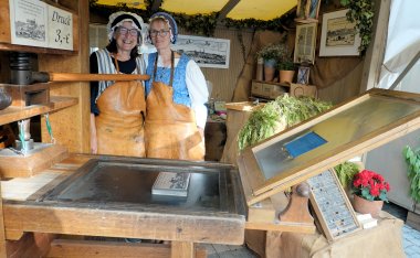 Seit dem 1. Stadtfest führt die Druckerei Matthäus die historische Drucktechnik mit Bleilettern, Druckerschwärze und Handpresse auf Papier vor.