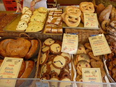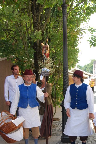 An die Stelle des Herzogs, der die Semmeln spendete, treten die Bäcker des Altstadtfestes, Knoll, Scharold und Schwab. Sie backen „Semmeln aus feinem Zopfteig mit Rosinen“ und verteilen sie nach dem feierlichen Gottesdienst am 2. Sonntag im Stadtfest an die Kirchenbesucher/innen. Robert Böck schreibt im Friedberger Stadtbuch, was ein Bäcker bei seiner Meisterprüfung nach der Zunftordnung von 1778 können muss: „ Semmel, Röckel, Wecken, Haus Brod aus alleinigen Rocken, dann gesottene Brezen, und Eyerbrod zu machen, all dieses selbst zu würken (kneten), und zu schüsßen (=in den Backofen einzuschießen). Die „gesottenen“ Brezen, Brezen aus feinem Hefeteig ohne Lauge und mit Salz bestreut, wurden wie die „Beigl-Krapfen“ vor dem Backen kurz im Wasser gekocht. Die „Fastenbrezen“ wurden in Friedberg noch zu Beginn des 20. Jahrhunderts angeboten. Die Bäcker Knoll, Scharold und Schwab verkaufen an ihren Ständen Backwaren nach traditionellen Rezepten an. Kult ist geworden, beim Verlassen des Stadtfestes noch ein Küchlein mit Kompott zu verspeisen.