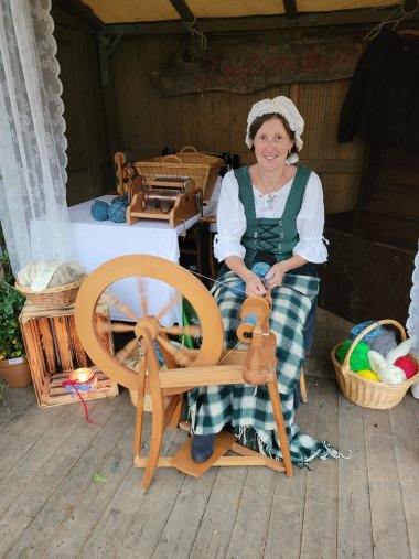 In der „Friedberger Zeit“ des 17. und 18. Jahrhunderts war bei uns bestimmt das Spinnrad mit Fußantrieb in Gebrauch. Die Spinnerinnen verarbeiteten die Fasern durch Verdrehen und Auseinanderziehen zu einem Faden für den Strumpfstricker und Strumpfwirker, von denen jeweils einer im Seelenbeschrieb 1789 genannt ist. Frau Sonja Rössig vom Schloss Haslangkreit zeigt während des Friedberger Stadtfestes ihr Können am Spinnrad.