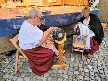 Auch zwei Klöpplerinnen sind neben ihr zu bewundern, die früher kostbare, oft goldene Spitzen für die Hauben, die Tücher und die Mieder herstellten.