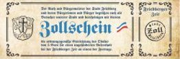 Zöllner und ZollscheinBei der Gründung der Burg Friedberg (um 1257) und der Stadt Friedberg (1264) spielten neben der Grenzsicherung die damit verbundenen Zolleinnahmen eine große Rolle. Im Rechnungsbuch Herzog Ludwigs um 1290 werden neben anderen herzoglichen Beamten in Friedberg bereits zwei Zöllner genannt. In Friedberg wurden mehrere Arten von Zoll erhoben: der Salz-, Wege-, Brücken-, Markt- und Pflasterzoll. Die Einnahmen des Pflasterzolls durch die Stadt durfte Friedberg ab 1462 behalten, für jeden Wagen mit Waren einen Pfennig, musste aber die Straße erhalten. Als letzter Pflasterzolleinnehmer fungierte vom 1. September 1927 bis zum 6. Oktober 1938 der Schuhmacher Otto Sepp mit seinen Hilfszöllnern. (Literatur: Georg Kerle, Märkte, Handel und Verkehr in: Stadtbuch Friedberg).