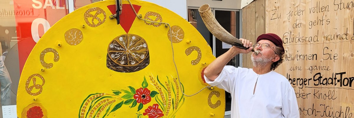 Auf dem Friedberger Altstadtfest lässt der Bäckermeister Knoll ein Glücksrad drehen, wobei als Hauptgewinn eine Altstadtfest-Torte zu gewinnen ist. Daneben gibt es viele weitere Gewinne. 1 Mal drehen kostet 3 Euro. Der Reingewinn der Glücksradlotterie wird dem Museum im Wittelsbacher Schloss gespendet. Das Foto zeigt das Glücksrad und Bäckermeister Knoll auf dem Altstadtfest 2023. Früher wurde mit dem Blasen ins Horn angezeigt, dass das Brot fertig war.